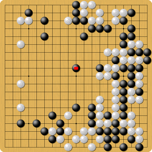Rileggendomi noto che non sono riuscito a rimanere distaccato e imparziale come avrei voluto e spero di non aver tediato i lettori con l'entusiasmo col quale, da circa un anno, accompagno i miei ardui tentativi di comprendere le dinamiche, le astuzie, i continui ribaltamenti di fronte, le finte, le minacce, le invasioni, le ritirate, gli agguati e le sorprese incessanti che si celano dietro ogni mossa del Go. Lasciandovi quindi alla scoperta di questo labirinto dilatato e affascinante, e giusto per dare un'idea grafica (ahimé statica) di una partita in corso, chiudo con l'immagine del momento cruciale (evidenziato in rosso) di un altro memorabile incontro del passato (1846 per l'esattezza, meglio noto come "Ear-Reddening Game", per chi volesse indagarne i curiosi retroscena).