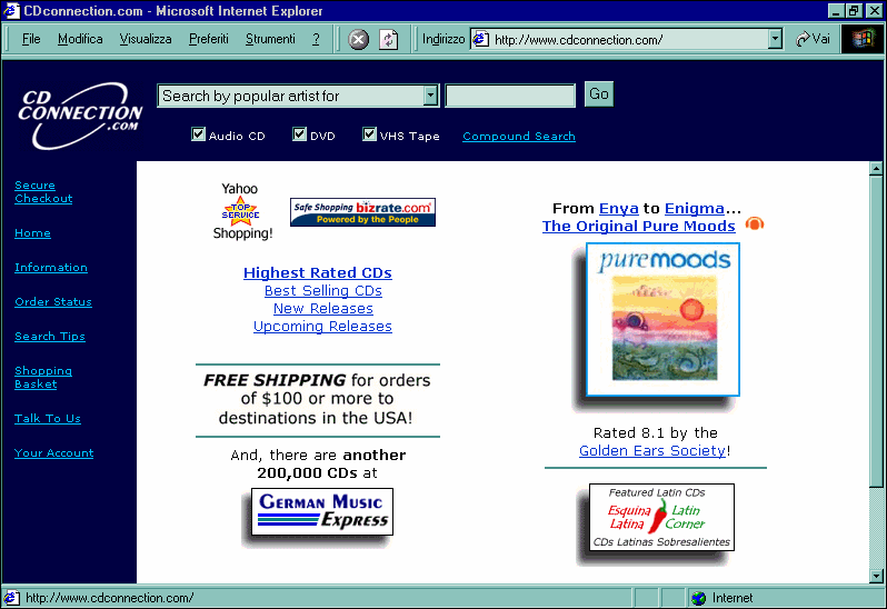 Stabilito questo non resta che avventurarsi in rete a caccia di merci. Per noi italiani, ad esempio, internet è una vera manna quando si tratta di acquistare CD musicali, il cui prezzo dalle nostre parti è notoriamente iniquo. Negli USA invece un CD costa circa la metà e quindi, pure aggiungendo le tasse e le notevoli spese di spedizione (che diminuiscono in percentuale all'aumentare del numero di dischi ordinati), magari per via aerea (così da avere il pacchetto in poco più di una settimana), si può risparmiare fino al 35% rispetto al prezzo fatto dal "discaro" sotto casa. Ovviamente ci si dovrà limitare ai dischi statunitensi evitando quelli importati (più cari), ma ciò non è un problema quando ci si rivolge a negozi virtuali del calibro di http://www.cdconnection.com/ (il mio preferito) o http://www.cdnow.com/ (che spesso fa prezzi migliori) o ancora http://www.cduniverse.com/ o http://www.amazon.com/ (che non vende più solo libri!), ciascuno dei quali ha in catalogo centinaia di migliaia di dischi: ce ne è veramente per tutti i gusti!